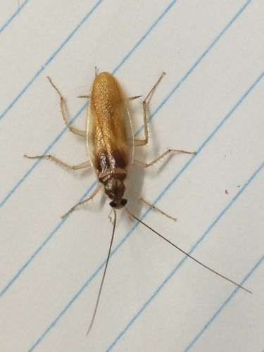 - Small light brown roaches with visible banding, particularly near ceiling lights or upper cabinet interiors after dark