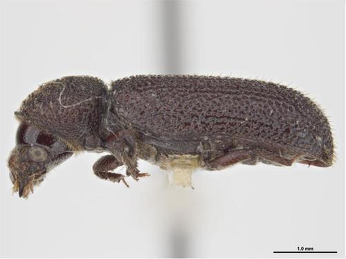 Bostrichid beetle category thumbnail (close-up dorsal view of pine powderpost beetle): Title: Pine Powderpost Beetle (Stephanopachys substriatus), Author: Sarah McCaffrey, Museum Victoria, Source: https://inaturalist-open-data.s3.amazonaws.com/photos/14030270/medium.jpg, License: CC BY, Modifications: Cropped to 300×300 square.